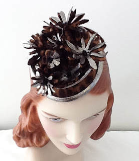 This is a Figure 8 clamp style Hat from the 30's/40's. I bought this original years ago and it still had the paper 10 cent price tag on it from Woolworths. Trust. The tag disintegrated BOO! Its a sweet little black number. I styled my leather flowers after the little vintage bouquet pinned to the side of the skull block.